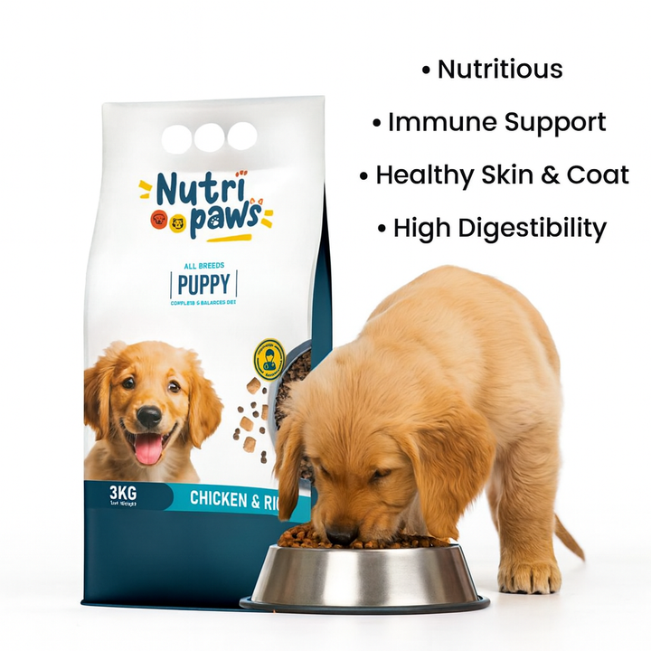 Give your puppy the perfect start in life with Nutri Paws All Breeds Puppy Food. Specially formulated with chicken & rice, this complete and balanced diet provides the essential nutrients your growing pup needs for healthy development, strong immunity, and boundless energy.