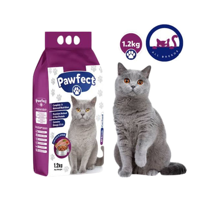 Pawfect is a brand of premium cat food, produced in Pakistan, that focuses on providing complete and balanced nutrition for cats and kittens. It's known for using high-quality animal and fish protein, along with essential omega-3 and omega-6 fatty acids. Pawfect aims to support various aspects of feline health, including strong bones and teeth, a shiny coat, and good digestion.