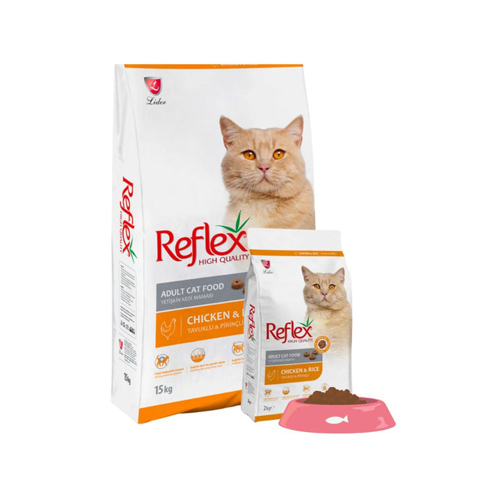 Reflex Adult Cat Food with Chicken & Rice is specifically formulated to help adult cats lead a healthy and happy life. It features chicken as the primary protein source, selected to meet the daily nutritional needs of adult cats, offering a complete and balanced feeding opportunity.