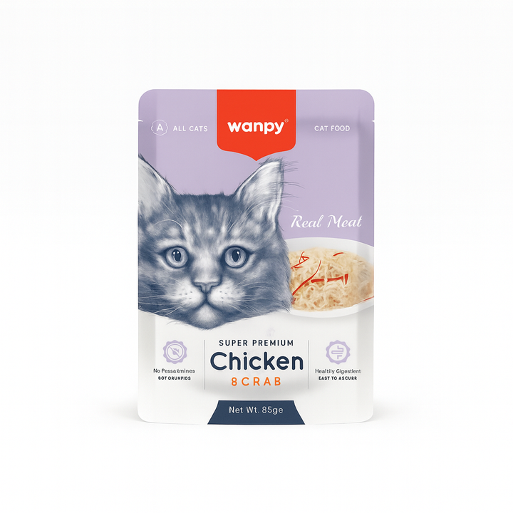 Treat your cat to a gourmet meal with Wanpy Super Premium Chicken & Crab Cat Food. Made with real meat, this delicious recipe combines tender chicken with the delicate taste of crab, providing both flavor and nutrition in every bite. Specially crafted for cats of all breeds, it’s a healthy choice that supports digestion and overall well-being.